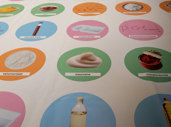 Performance 'Twister Fries - the special edition': where all 55 components of Patatje Speciaal are made visible on a Twister mat. Designed in collaboration with graphic designer Dionne Mokkenstorm.